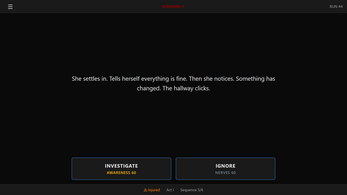 I really like it! I like the slow advancement of the final girl. I do wanna flag a bug that sometimes I choose an option and I feel like the responding text is the answer for the other option. Like choosing "stay quiet" and the text says "someone hears." Not sure if others see this.