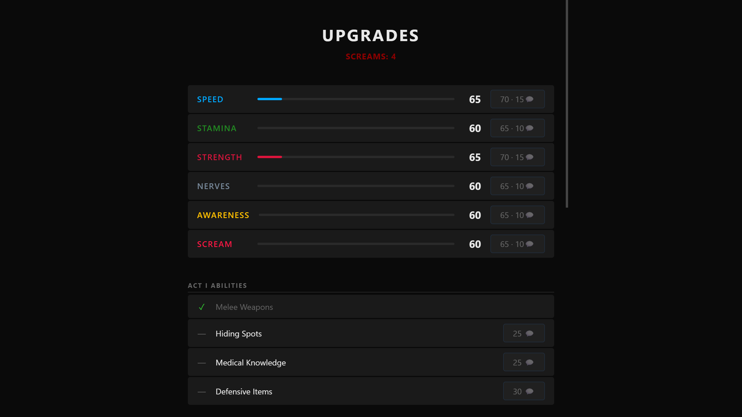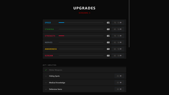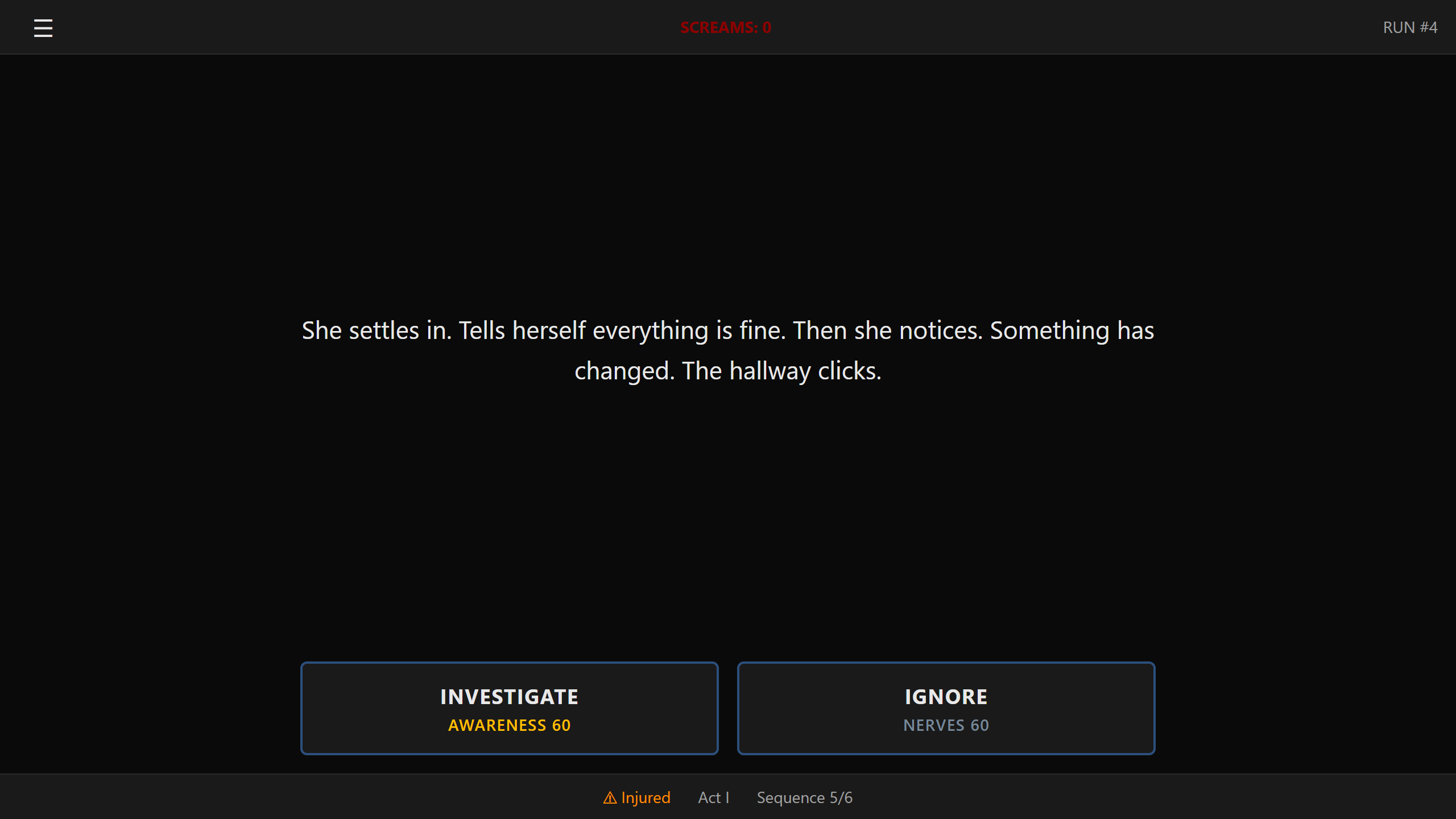 - Runs last 30 seconds to 4 minutes • Each run has 3 Acts with escalating danger • At key moments, choose between 2 options, each tied to a stat (Speed, Stamina, Strength, Nerves, Awareness, Scream) • Stats determine outcomes, not player skill • Die → earn SCREAMS → upgrade → try again