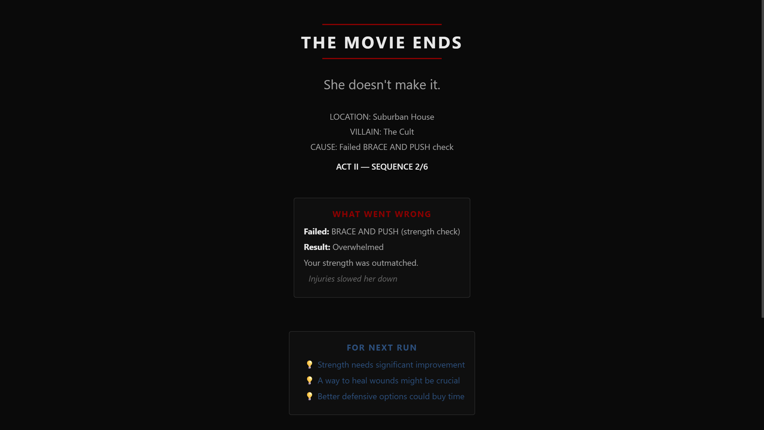 - 9 locations × 7 villains × 22 situation templates (42,000+ possible run combinations) • Full progression: 6 upgradeable stats + 14 unlockable abilities • Death feedback: see exactly why you died and what to improve • Sound FX for key moments • Saves automatically between sessions