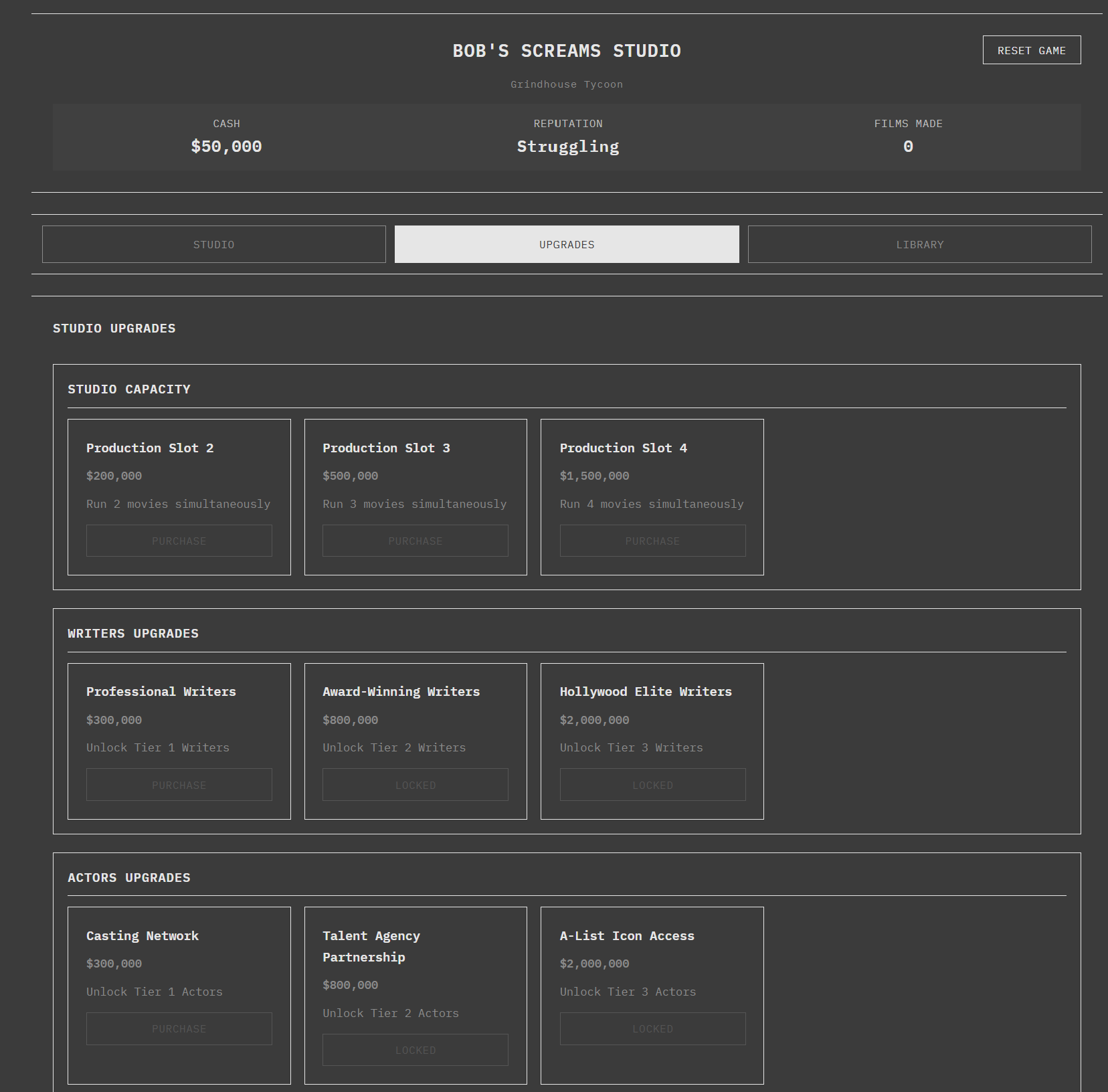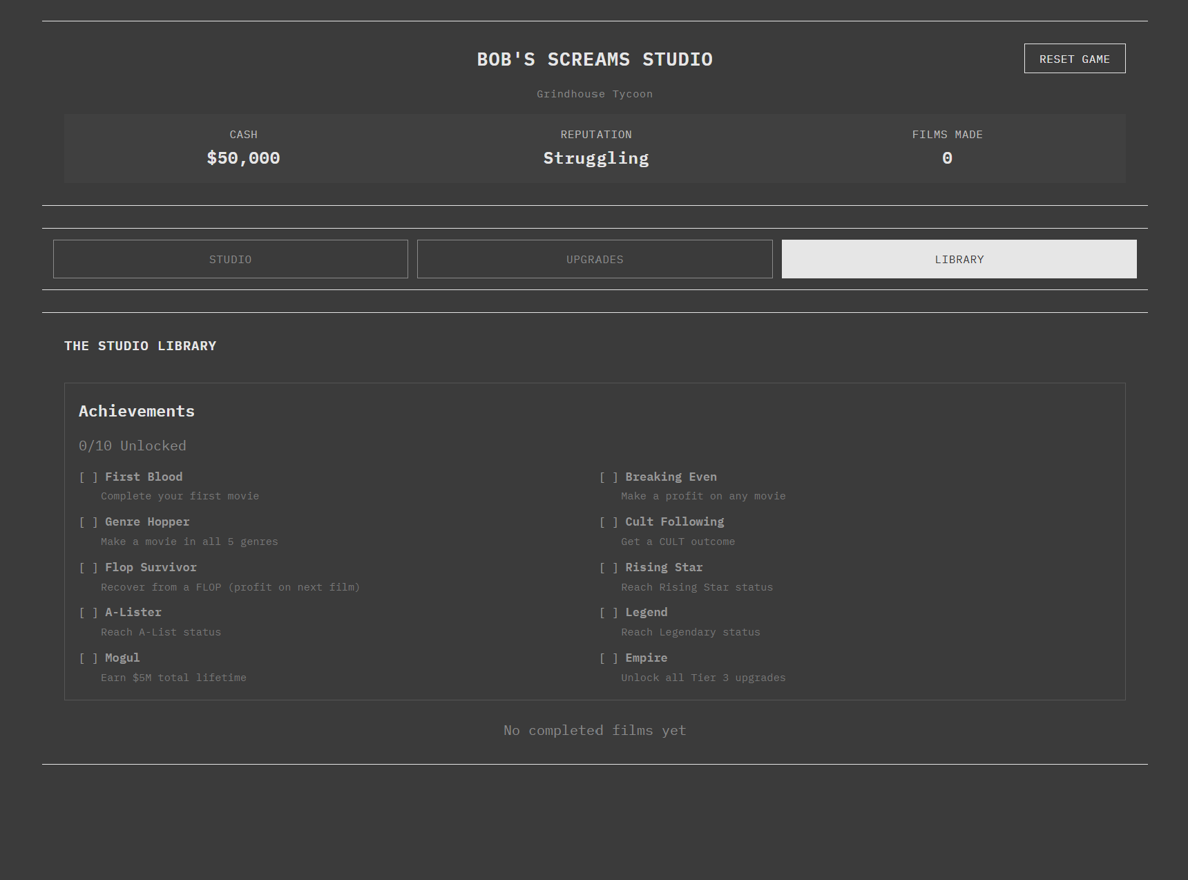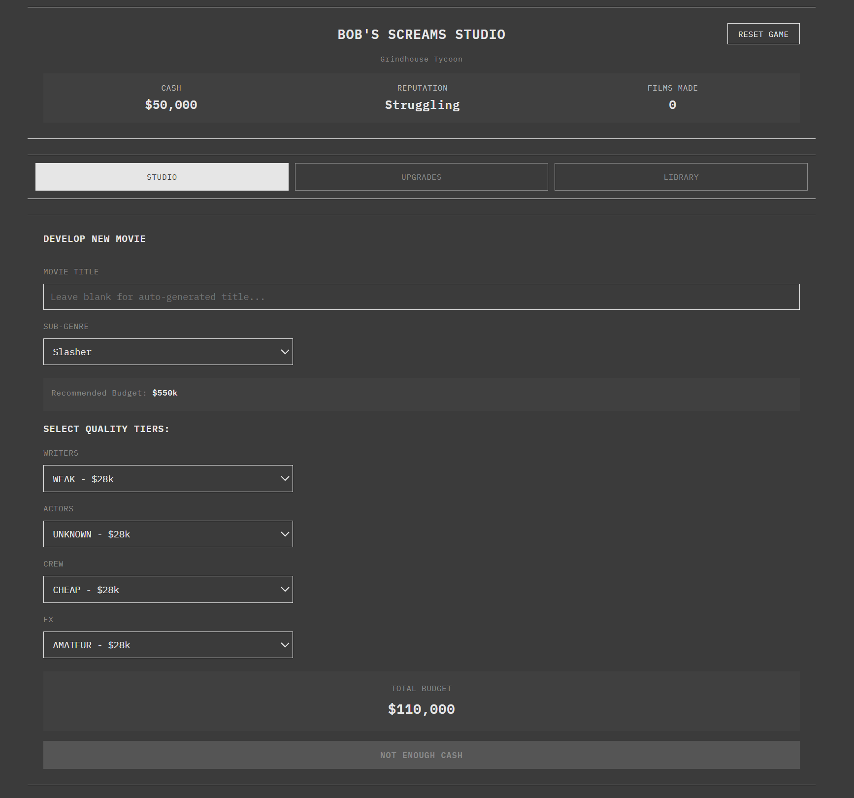 Run a horror movie studio. Allocate budgets, watch productions unfold, and experience the suspense of box office reveals